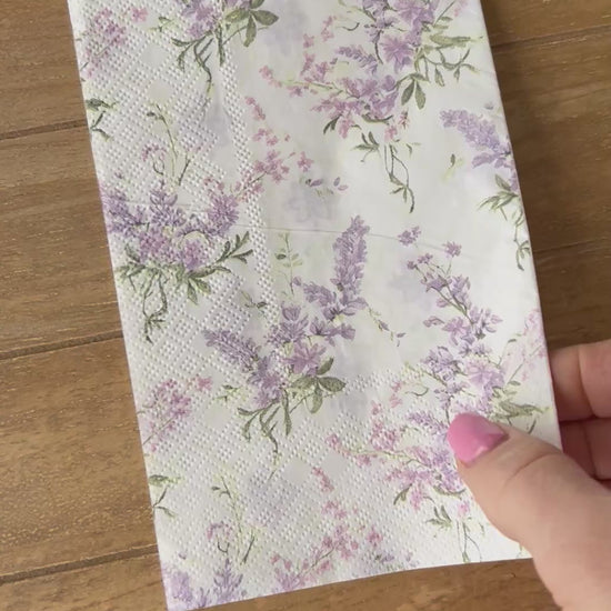 Choose our 4.5x8" Triple Print Purples PAPER hand napkin for your decoupage decor needs. Buy 4 of any of our single Napkins and only pay $5. The discount will be applied automatically. Simply add four individual napkins to your cart.