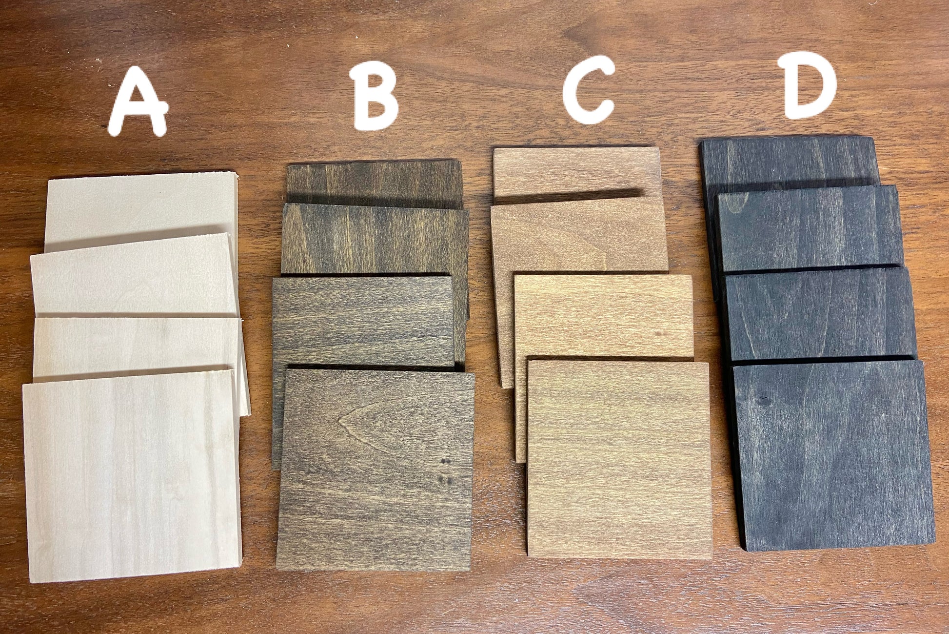 These coasters measure 3.5x3.5x.25 inches and come in four different options: unfinished, dark walnut, early American, and black.