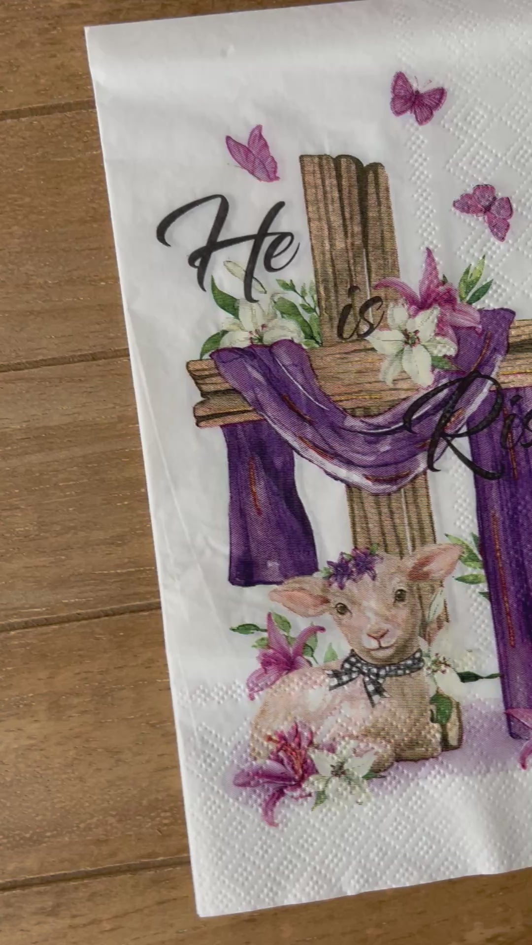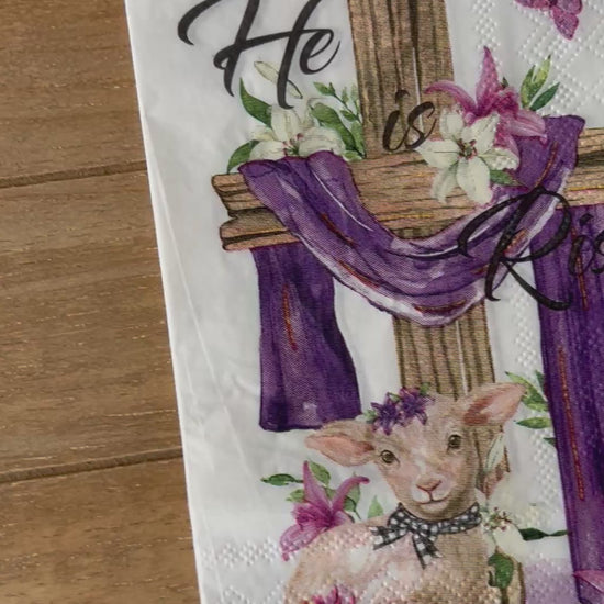 Choose our 4.5x8" He is Risen Lamb PAPER hand napkin for your decoupage decor needs. Buy 4 of any of our single Napkins and only pay $5. The discount will be applied automatically. Simply add four individual napkins to your cart.