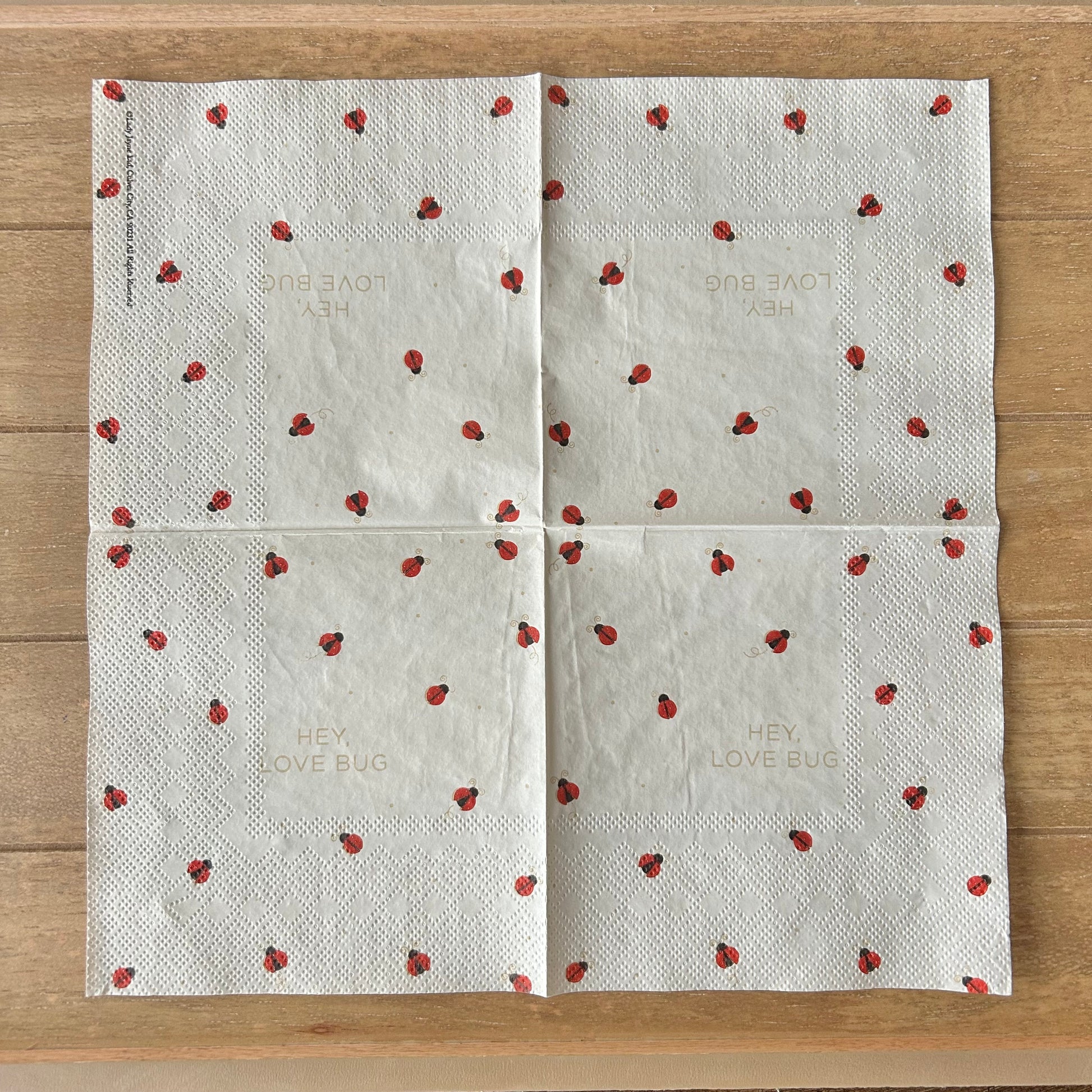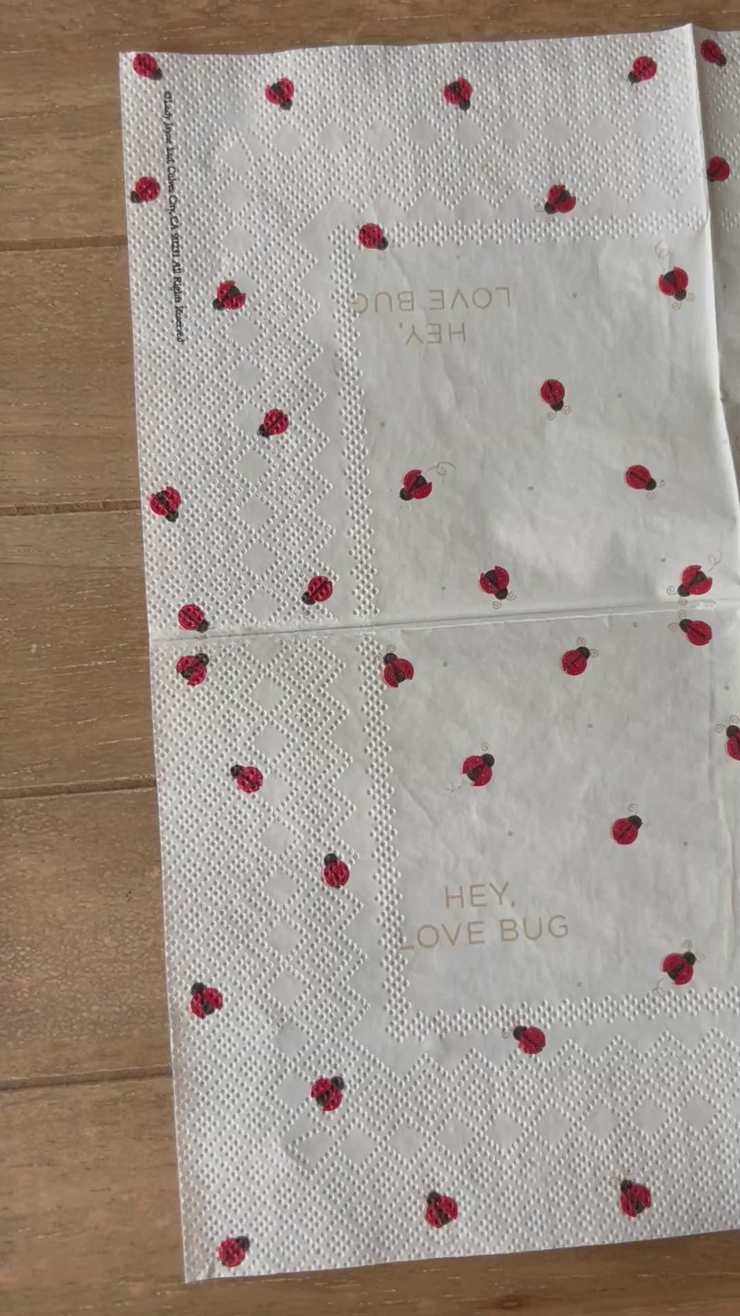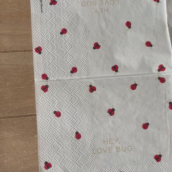 Choose our 5x5” Hey Love Bug Ladybug PAPER cocktail napkin for your decoupage decor needs. Buy 4 of any of our single Napkins and only pay $5. The discount will be applied automatically. Simply add four individual napkins to your cart.