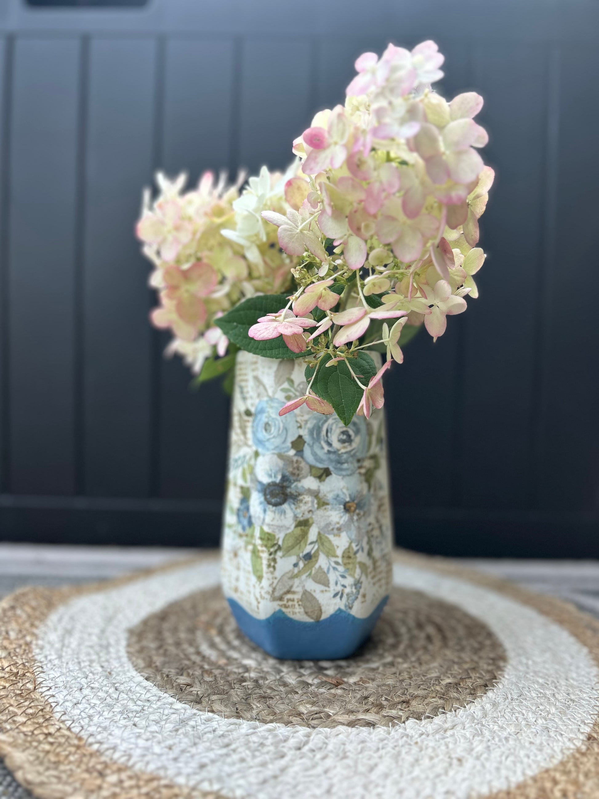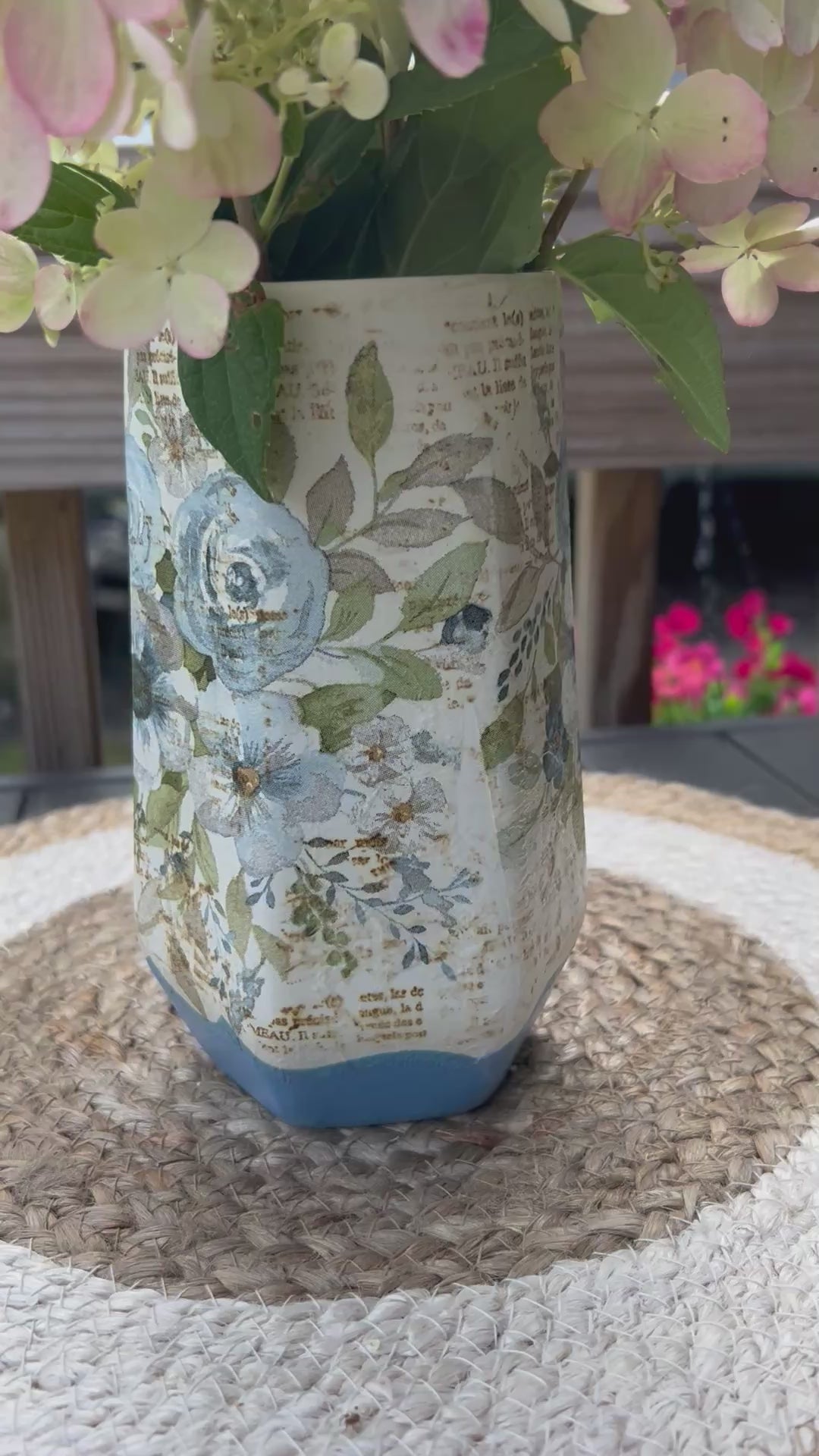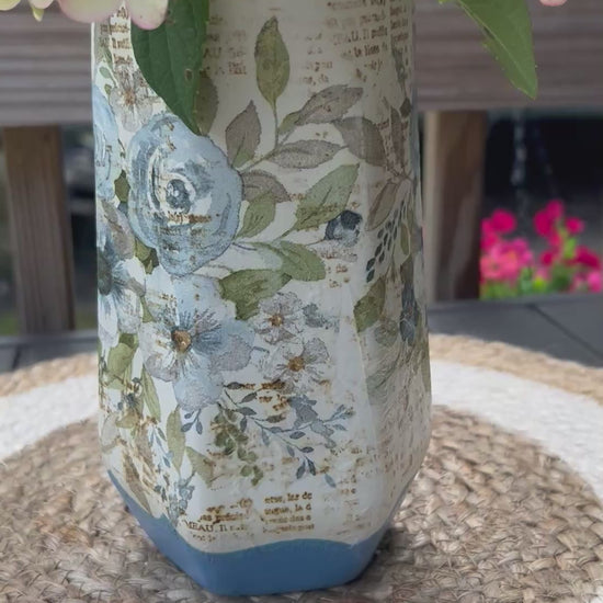 Add a splash of charm to any room with this one-of-a-kind vase featuring a delightful blue floral decoupage design. Perfect for showcasing your favorite blooms or standing solo as a statement piece. Handle with care—spot clean only to keep its vintagey beauty shining bright!